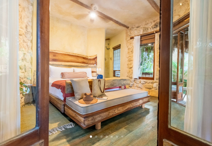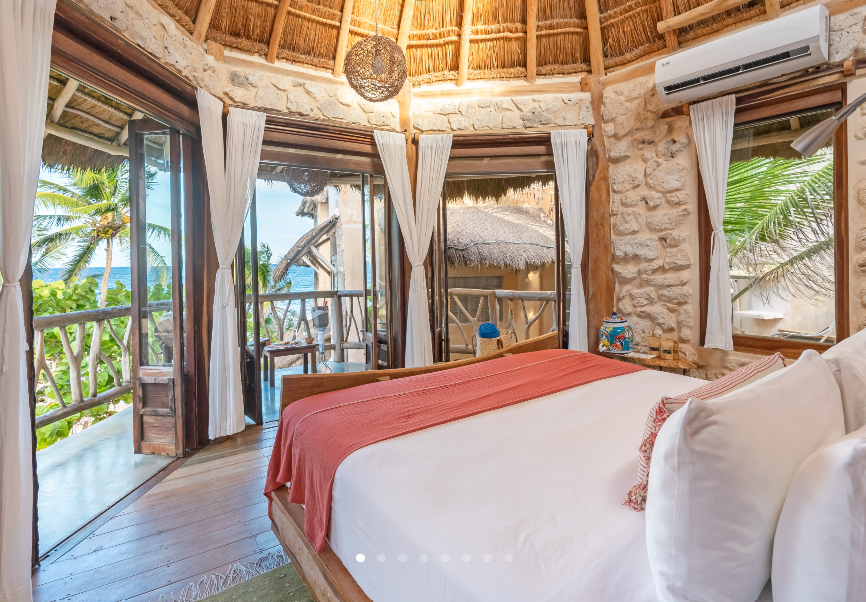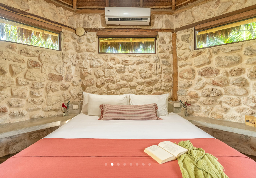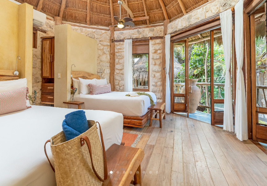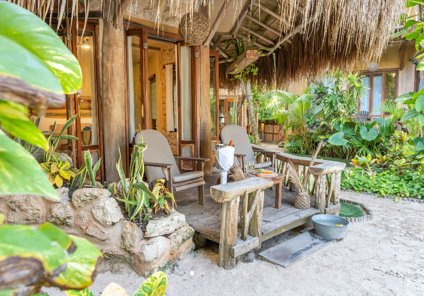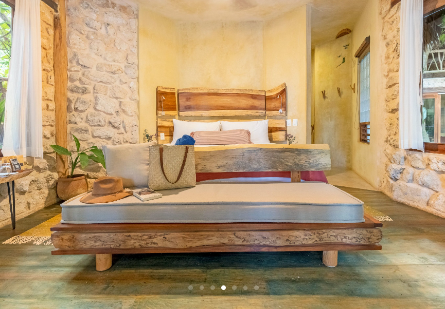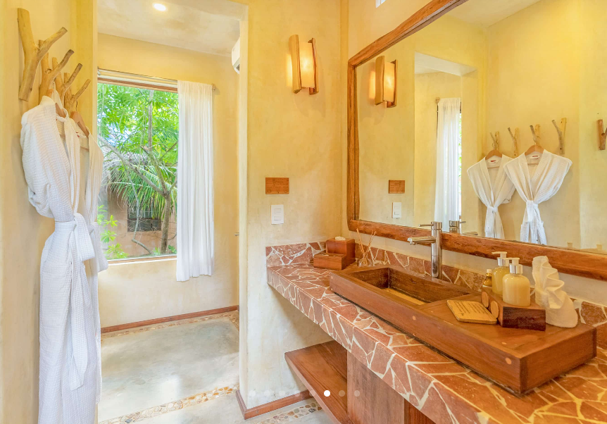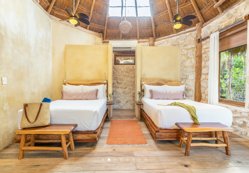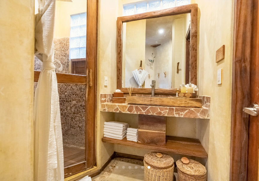 Fall asleep surrounded by the lush Mayan jungle and wake to views of the Caribbean from your private beach cabin. These beachfront accommodations offer a truly magical Tulum experience, inviting deep rest, connection, and renewal. The beautiful eco-chic cabins, villas, and apartments are thoughtfully designed with natural materials and sustainable practices that honor and protect the local ecosystem. Each space features handcrafted wood furnishings, stone walls, and raw, earthy elements that create a calming, grounded atmosphere. Unwind in spa-inspired bathrooms with rain showers and glass walls to bring some nature within.