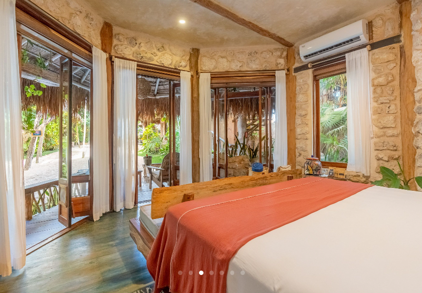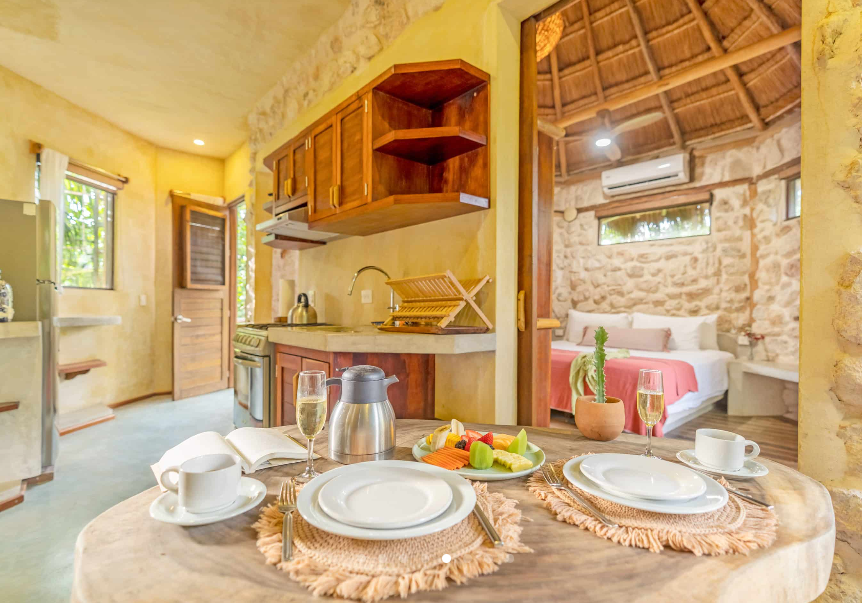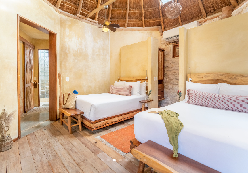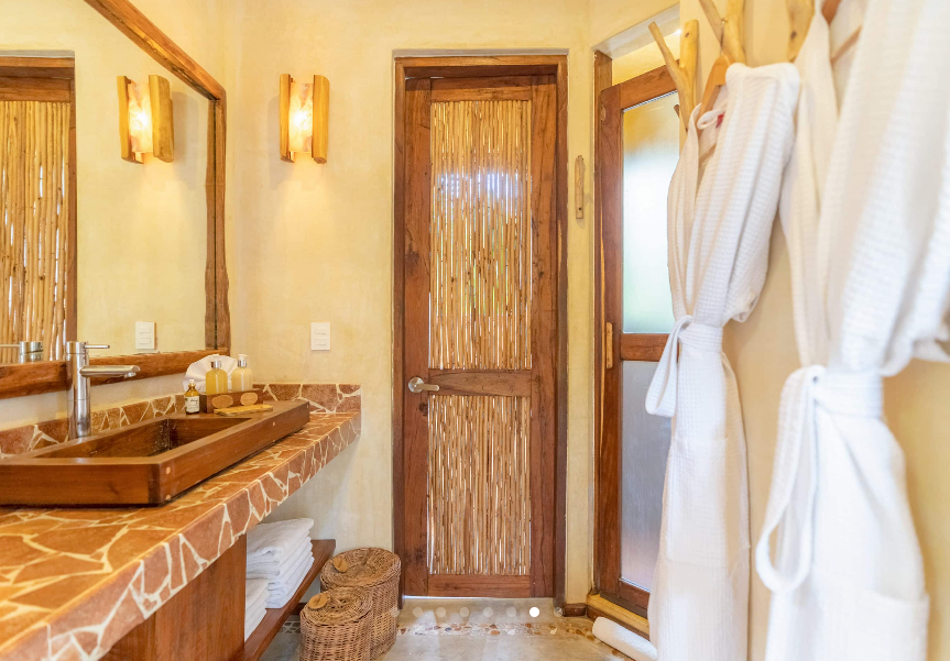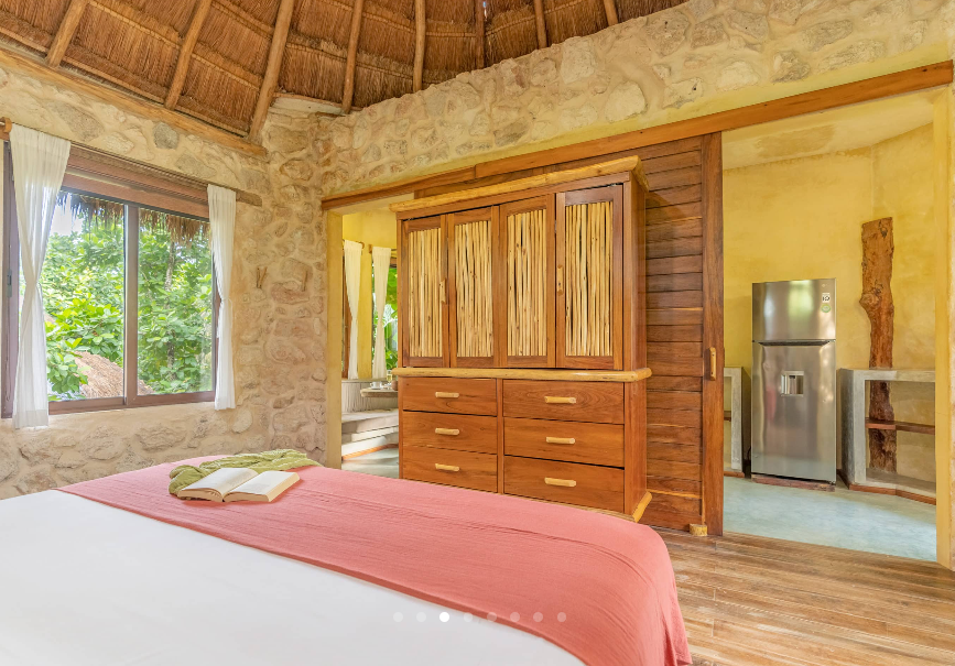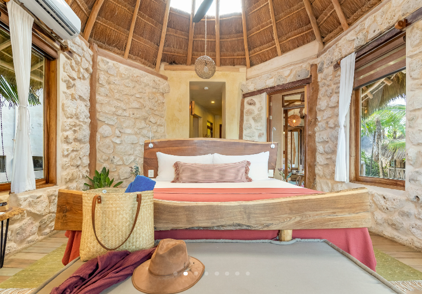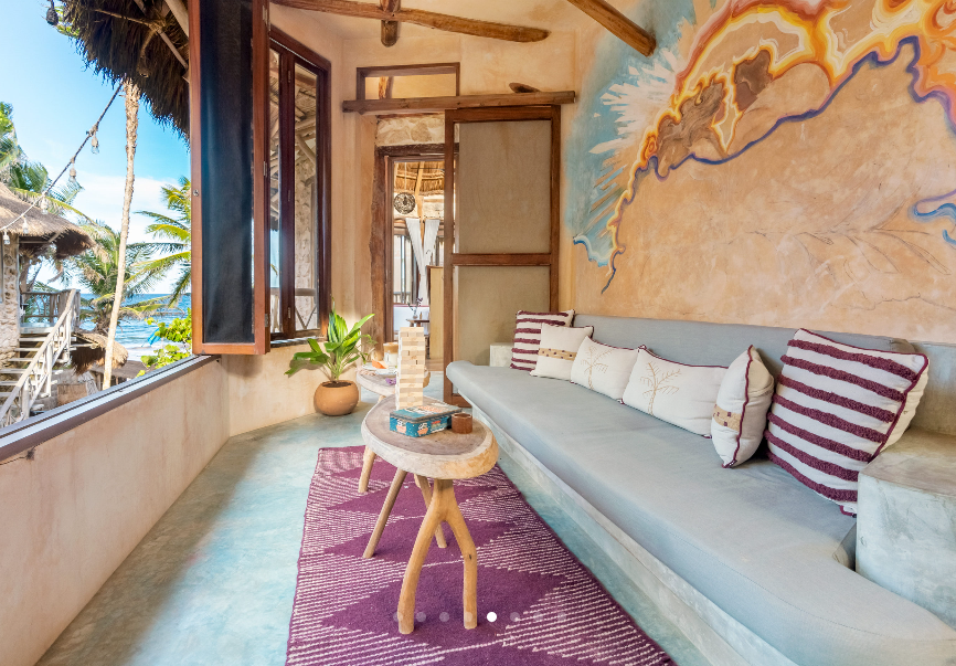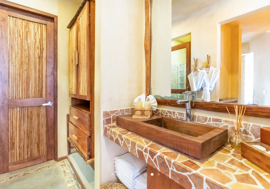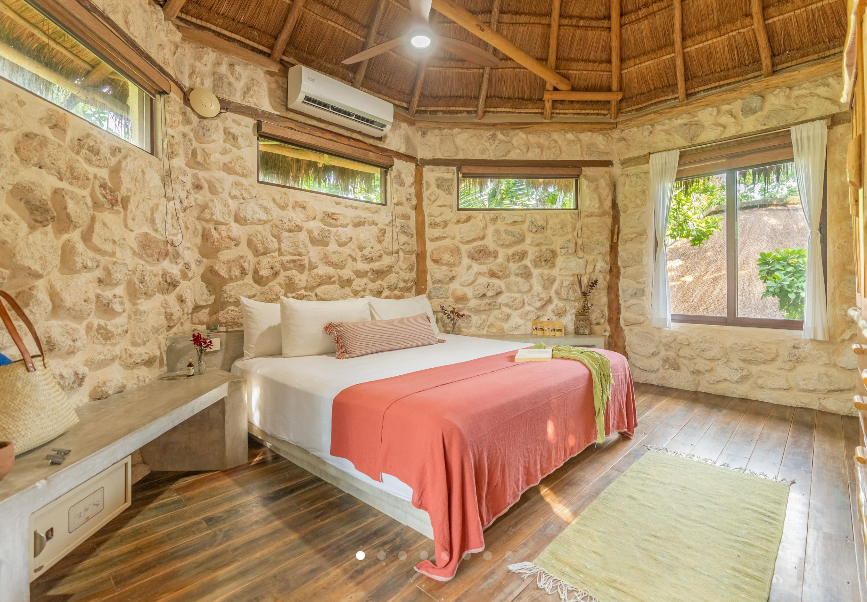 Fall asleep surrounded by the lush Mayan jungle and wake to views of the Caribbean from your private beach cabin. These beachfront accommodations offer a truly magical Tulum experience, inviting deep rest, connection, and renewal. The beautiful eco-chic cabins, villas, and apartments are thoughtfully designed with natural materials and sustainable practices that honor and protect the local ecosystem. Each space features handcrafted wood furnishings, stone walls, and raw, earthy elements that create a calming, grounded atmosphere. Unwind in spa-inspired bathrooms with rain showers and glass walls to bring some nature within.